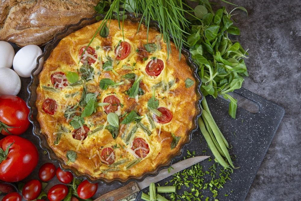 • Η ομελέτα. Χτυπήστε τα αυγά και προσθέστε όλα τα υλικά και τα μπαχαρικά στο μίγμα. Τοποθετήστε το μίγμα σε λαδωμένο αντικολλητικό σκεύος και ψήστε στις αντιστάσεις, πάνω-κάτω σε μέτρια θερμοκρασία μέχρι να πήξει.